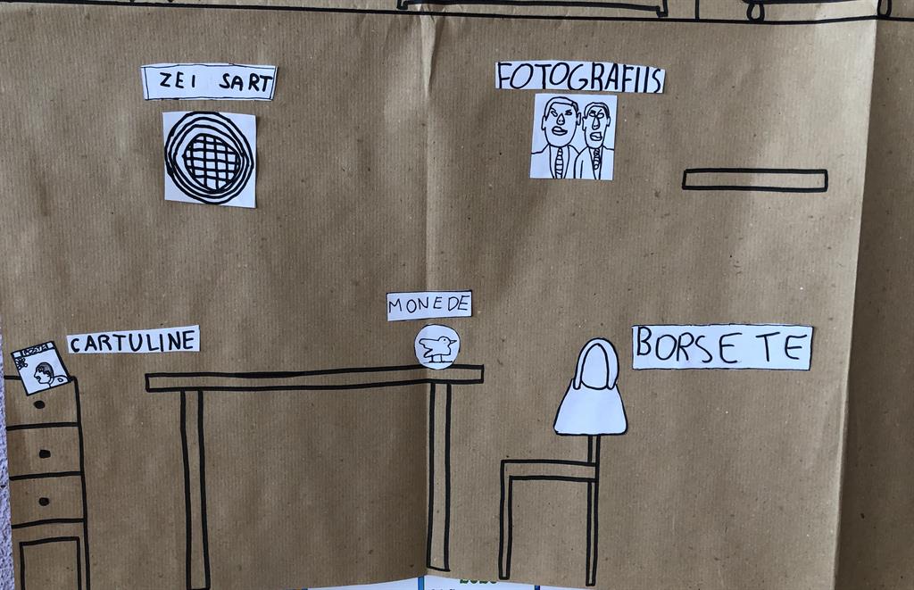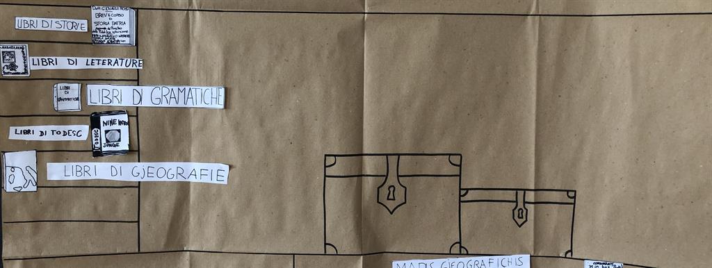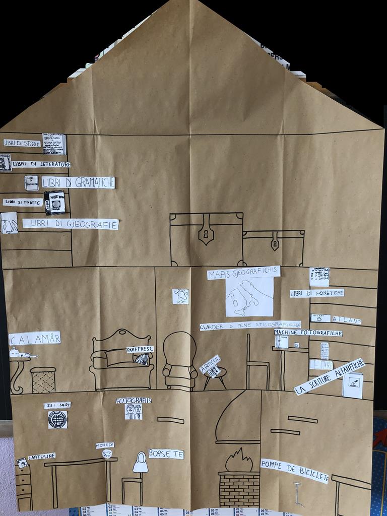 Negli spazi esterni della scuola primaria è stata organizzata una “caccia al tesoro” dove i bambini dovevano rinvenire una serie di fotografie di oggetti appartenuti a Ugo Pellis. Al termine della ricerca ogni bambino disponeva di almeno una fotografia (i bambini che avevano trovato più fotografie hanno condiviso i loro materiali con chi non ne aveva). Terminata la raccolta delle foto, attraverso un brainstorming, i bambini hanno iniziato a riflettere sul tipo di oggetto trovato e sul suo possibile utilizzo: quando ogni oggetto è stato analizzato l’insegnante lo ha nominato in friulano e ha scritto la parola alla lavagna. In seguito i bambini hanno riprodotto su un foglio l’oggetto della foto e il nome corrispondente in friulano, quindi hanno ritagliato e incollato i disegni e i vocaboli su un cartellone dove era stata riprodotta la casa del personaggio misterioso, cercando di collocarli nella stanza opportuna e avviando un'ulteriore riflessione su ogni singolo oggetto. I bambini hanno avanzato delle ipotesi su chi poteva essere il personaggio e hanno realizzato degli identikit.