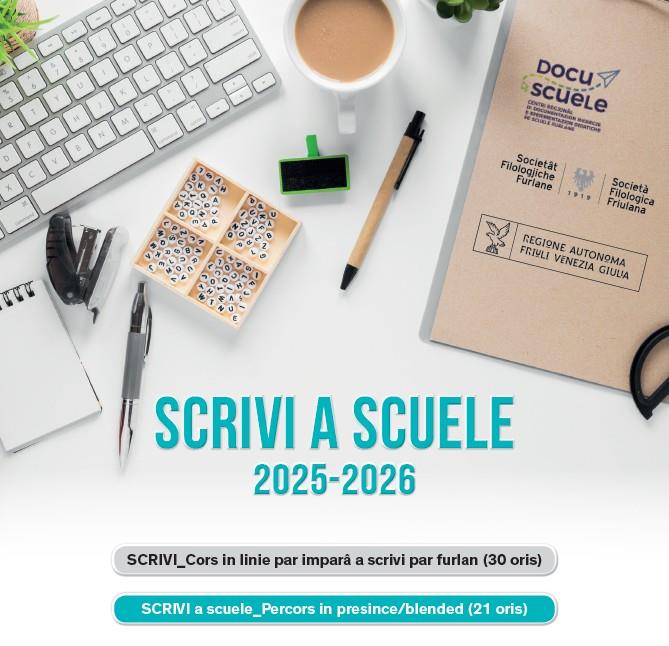 IMPUARTANT: il percors SCRIVI_Cors in linie par imparâ a scrivi par furlan (30 oris) su la nestre plateforme Moodle al è propedeutic al cors in presince, cui che lu à za fat prime dal 2024 al varà di tornâ a dâi un cuc prime di tacâ il cors in presince e al è ben che al scrivi a info@scuelefurlane.it par vê dutis lis indicazions. Il percors di formazion al è ricognossût par 51 oris cun atestâts di pueste.